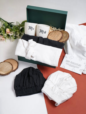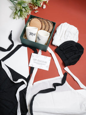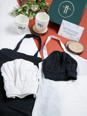 Step into the kitchen of love and creativity with our "Bake and Sip" anniversary hamper. Crafted to inspire culinary adventures together, this thoughtful collection includes unbreakable mugs, chef hats, matching aprons, and wooden coasters. As you don your chef attire and embark on a culinary journey, let the aroma of freshly baked delights fill your home, while you share intimate moments over a cup of your favourite beverage. Embrace the joy of creating memories together, one delicious recipe and heartfelt conversation at a time.