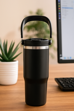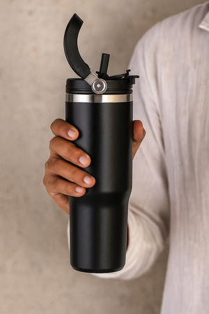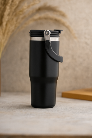 Stay refreshed all day with our sleek 900ml Coffee Tumbler – the perfect companion for your daily routine. Crafted with a durable stainless steel inner and double-walled vacuum insulation, this tumbler keeps your beverages hot or cold for hours. It features a convenient straw lid, along with one reusable plastic straw and one stainless steel straw, giving you sipping options on the go. The sturdy, ergonomic handle makes it easy to carry whether you're commuting, working, or traveling. Designed for both style and function, this matte black tumbler fits effortlessly into your active lifestyle.
