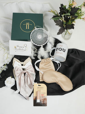 Celebrate her birthday and keep her happy dreams intact with our Dreamscape Box, meticulously crafted to elevate her nighttime routine. Ideal for any girl who cherishes her daily rituals, this special birthday edition includes luxurious satin hair pins, nourishing lip balm, a silky eye mask for uninterrupted rest, and a cozy mug perfect for enjoying soothing green tea before drifting off into a serene sleep.