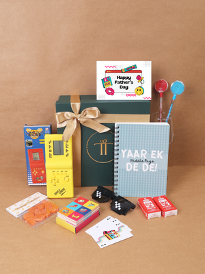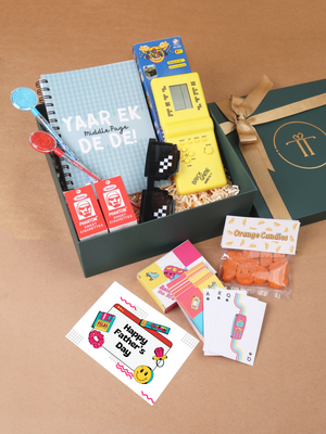 Bring back the magic of Dad’s childhood with Blast From The Past, a heartwarming Father’s Day hamper filled with memories from a simpler time. From 90s-themed playing cards and the classic yellow video game to a quirky school-style notebook, maze pencils, and the ever-cool Thug Life glasses, every piece is a joyful nod to days gone by. Complete with sweet cigarettes and tangy orange candies, it’s a sweet slice of nostalgia, lovingly packed in our classic green Tohfa Tales box with a message card. A gift to make him smile, remember, and feel like a kid again.