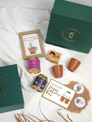 Father’s love for chai with the Chai Chuski Box, a warm and thoughtful hamper made for his tea-time moments. Featuring two flavourful tea tins from Oh Cha (Rose Mint & Earl Grey), a charming tea quote photo frame, a pair of classic kulhads, and quirky tea lover badges, it’s a delightful blend of nostalgia and flavor. Paired with the all-time favorite Parle-G biscuits and a heartfelt message card, all packed in our signature green Tohfa Tales box, this gift is a comforting hug in a box for every tea-loving dad.