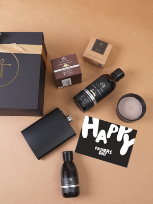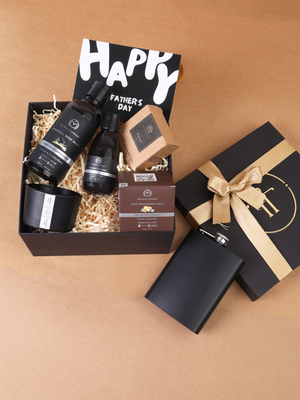 Give Dad the gift of unwinding in style with “The Urban Man,” a Father’s Day hamper made for his moments of calm and confidence. Packed with self-care essentials from The Man Company, including a charcoal & lemongrass body wash, charcoal & ylang-ylang face wash, nourishing soap, and a rich moisturizer with shea butter and vitamin E. It also features a sleek black hip flask and a smoky oak-scented soy wax candle in a ceramic jar for a touch of relaxation. Thoughtfully presented in our classic black Tohfa Tales box with a heartfelt message card, this hamper is all about celebrating his refined side.