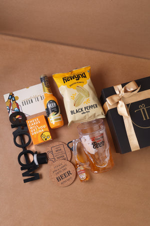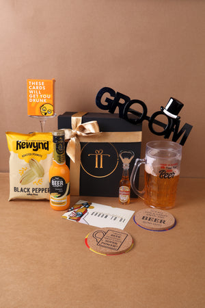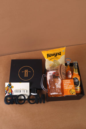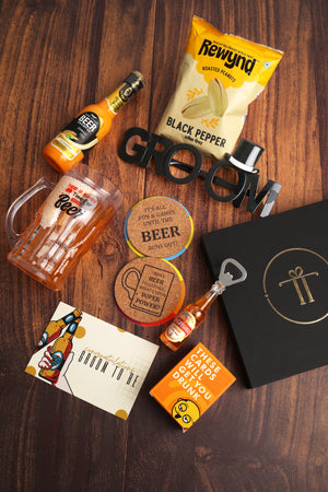 "Raise a toast to a day brimming with joy and laughter! Indulge in our Groom's Smiley Hour gift ensemble, meticulously curated just for you. Here's to your blissful journey ahead, filled with unforgettable moments and endless happiness!