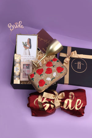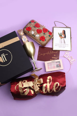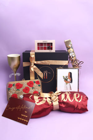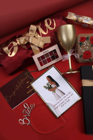 Elevate the bride's journey to "Happily Ever After" with our luxurious hamper. From chic accessories like the Bride Headband to indulgent treats such as Ferrero Rocher chocolates, each item is carefully selected to add glamour and sophistication to her special day. Perfect for pampering the bride as she prepares to embark on her new chapter of love and happiness.
