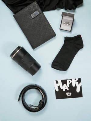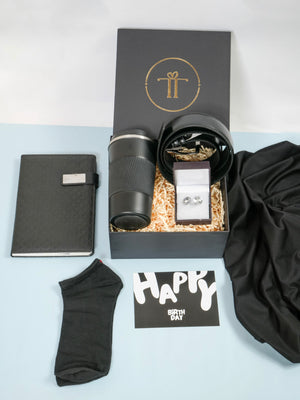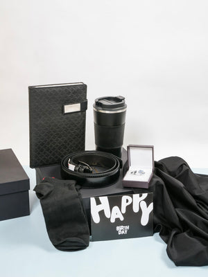 Honor the special man in your life with the Man In Black Box, a sophisticated ensemble celebrating timeless elegance. Within its beautifully adorned packaging, discover a selection of sleek essentials including socks, cufflinks, a diary, sipper, and belt, all exuding a sense of luxury and class. This meticulously curated gift is not only trendy but also embodies refinement, making it a perfect expression of appreciation for his special day.