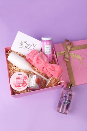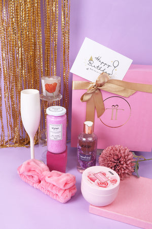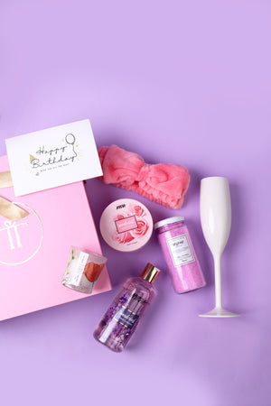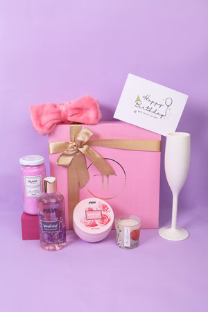 Treat her to an enchanting spa-like journey on her birthday with our Spa-ctacle Experience box. Featuring luxurious shower gel, fragrant bath salts, and nourishing body yogurt, this box offers more than just skincare essentials. Complete with a mood-setting candle, a soft headband for ultimate relaxation, and a sleek champagne glass to add a touch of elegance, this package creates the perfect ambiance for a blissful retreat. Soothe your senses, unwind, and embark on a rejuvenating journey as you begin your special day in the most indulgent way possible.