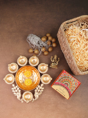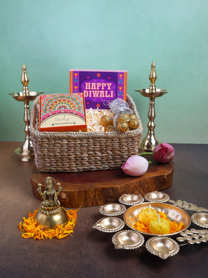 Embrace the divine spirit of Diwali with our enchanting hamper featuring a Laxmi idol, radiant lights, and soothing havan cones!